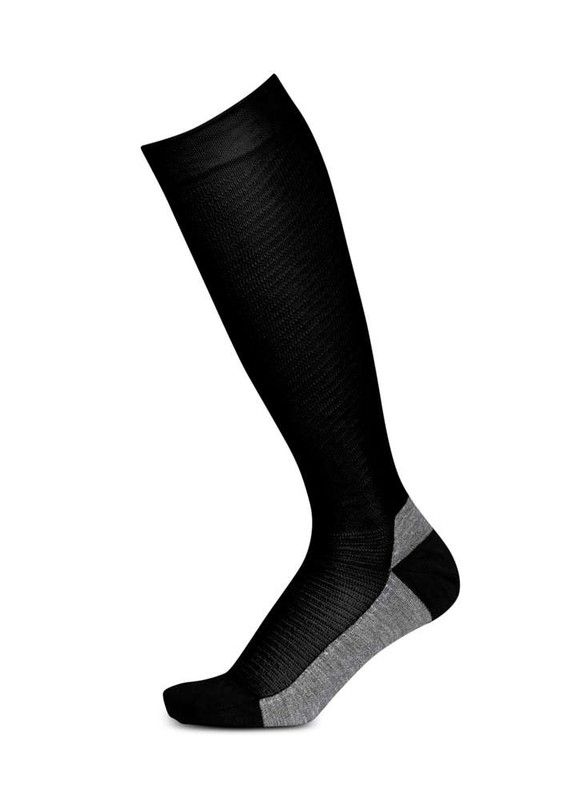 Compression stocking. Constructed in a helical structure with different compression in different parts of the sock, at the top of the ankle, progressively decreasing towards the top. This counteracts swelling and promotes blood circulation.